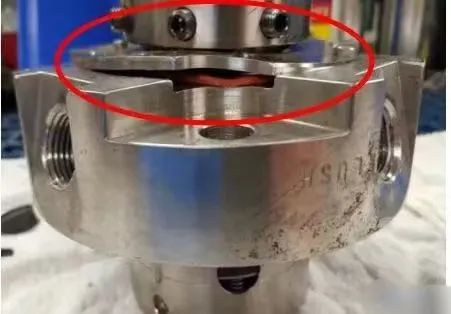 機(jī)械密封過(guò)壓會(huì)導(dǎo)致動(dòng)、靜環(huán)密封面外徑處發(fā)生重力觸摸,并向內(nèi)逐漸減小,直至簡(jiǎn)直沒(méi)有可見(jiàn)的觸摸。高壓會(huì)導(dǎo)致主密封環(huán)外徑邊際呈現(xiàn)碎裂(缺口)。