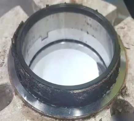 結(jié)焦會(huì)在機(jī)械密封的大氣側(cè)留下堆積物或研磨碎屑。當(dāng)密封在過(guò)高溫度下運(yùn)轉(zhuǎn)時(shí),會(huì)呈現(xiàn)這種聚積物,但也或許是因?yàn)闆_刷液不潔凈或外部環(huán)境帶來(lái)的污染等原因而呈現(xiàn)(見(jiàn)圖4)。