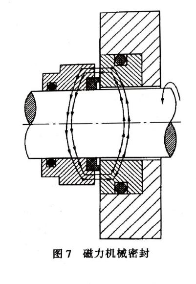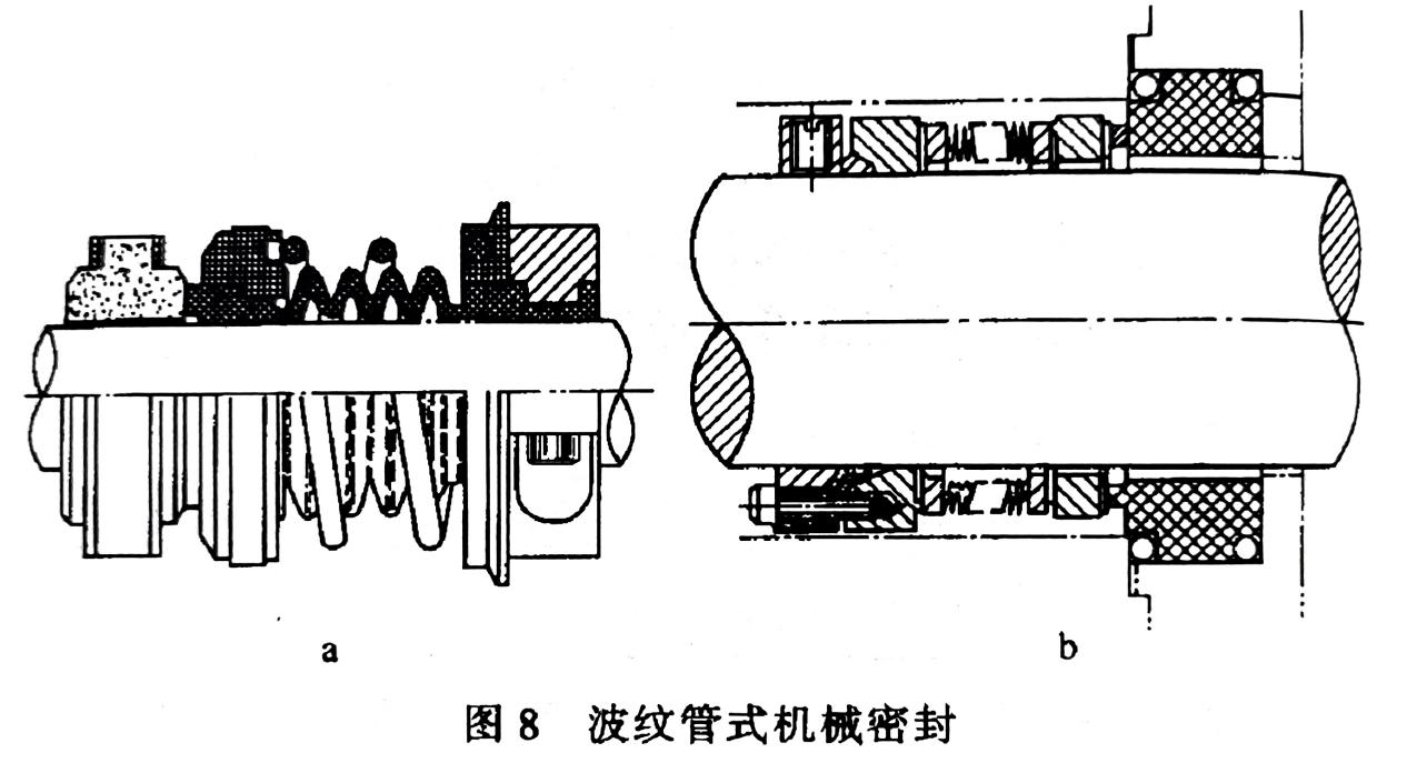 補(bǔ)償結(jié)構(gòu)的作用是使密封端面緊密貼合,為達(dá)到此目的,選用的辦法有兩種,一是彈性力,二是磁力。只有在系統(tǒng)內(nèi)壓力較低時采用磁力機(jī)械密封(圖7),大多數(shù)都用前者。除了用彈簧形成彈性力外還有用波紋管的,稱為波紋管式機(jī)械密封。波紋管的材質(zhì)可用橡膠、聚四氟乙烯(圖8a)和焊接的金屬薄片等(圖8b)。