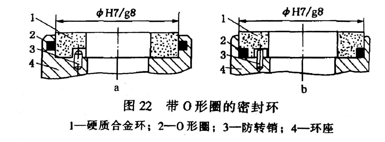 這種組合式密封環(huán)在硬質(zhì)合金環(huán)與環(huán)座之間用H7/g8的滑動(dòng)配合。在兩者配合的圓柱面間放置一聚四氟乙烯或合成橡膠制成的O形密封圈,避免其間的密封流體泄露,并且將硬質(zhì)合金環(huán)與環(huán)座結(jié)合在一起。在硬質(zhì)合金環(huán)與環(huán)座的平面結(jié)合處設(shè)一銷釘,以傳遞扭矩。此種組合結(jié)構(gòu),沒(méi)有組合應(yīng)力產(chǎn)生,也無(wú)由此引起的組合密封環(huán)的密封端面的變形,可是組合密封環(huán)零件的數(shù)量增加了,還需要在硬質(zhì)合金環(huán)上鉆孔或槽,給制造提高了難度,另外由于增設(shè)了O形圈,密封環(huán)的使用溫度受到了限制。