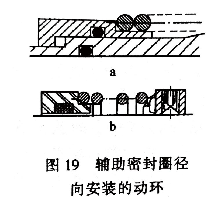 輔助密封圈徑向裝置的動環(huán)(圖19),靠密封圈的過盈和彈性實現(xiàn)密封,其材質(zhì)大多采用聚四氟乙烯和合成橡膠。伴隨使用時間變長,這兩種材質(zhì)分別呈現(xiàn)冷流變形和老化而失去彈性。有文獻記載,這種結(jié)構(gòu)的密封,有40%的失效發(fā)生在輔助密封圈位置。