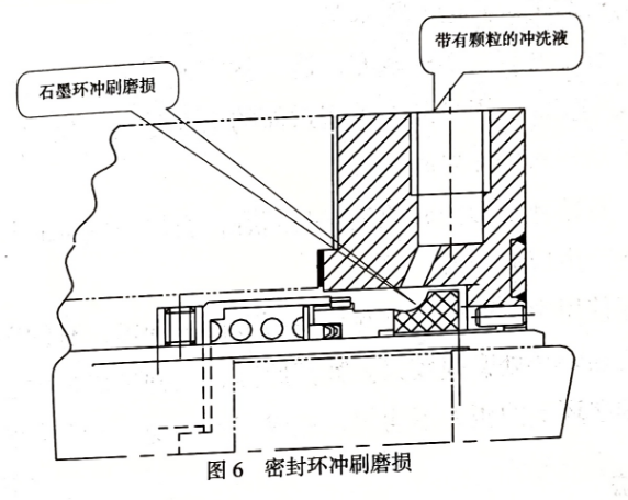 ◆原因分析過高的沖洗速度或沖洗孔的位置不當(dāng),以及沖洗液中含有顆粒都可能使密封環(huán)受到?jīng)_刷磨損(圖6)。