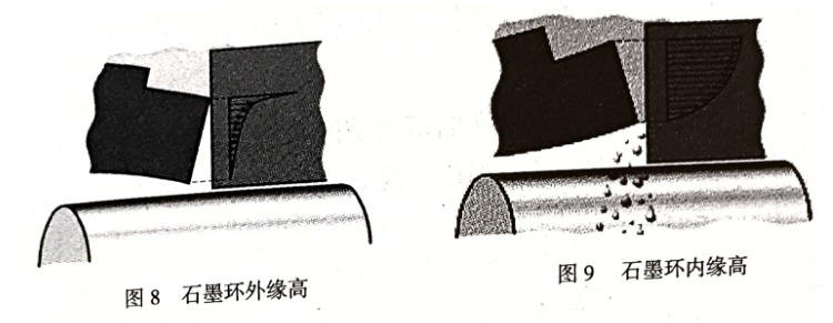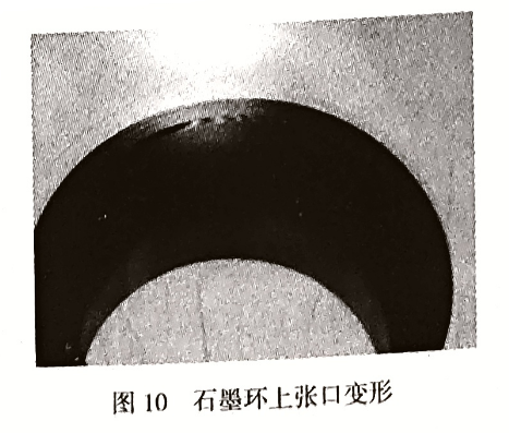 石墨環(huán)(窄環(huán))外緣高(上張口),端面間隙呈喇叭形(圖8);石墨環(huán)的內(nèi)緣(下張口)高(圖9),摩擦痕跡不連續(xù),或局部接觸,有時出現(xiàn)大半圓(俗稱馬蹄形),密封泄漏。