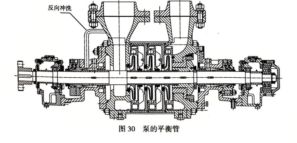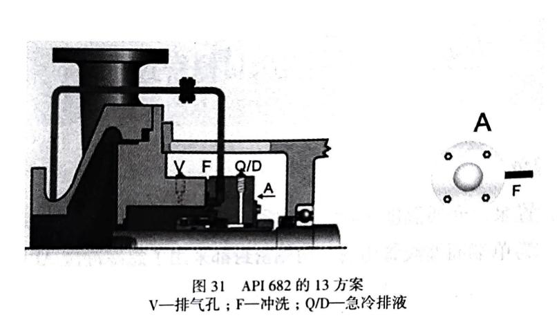 密封損壞的原因是水質結垢,波紋管的波峰和波谷被水垢填死,密封失去彈性,多次更換密封的結構形式還是出現類似的問題。經過查看泵的結構圖,大家一直認為的泵的平衡管的管線實際是一個反向旁通自沖洗(圖 30)。也就是 API682的 13 方案,如圖 31。這樣一來,該泵人口側密封就有了兩種沖洗方案,即 API682的 13 方案 +62 方案。
