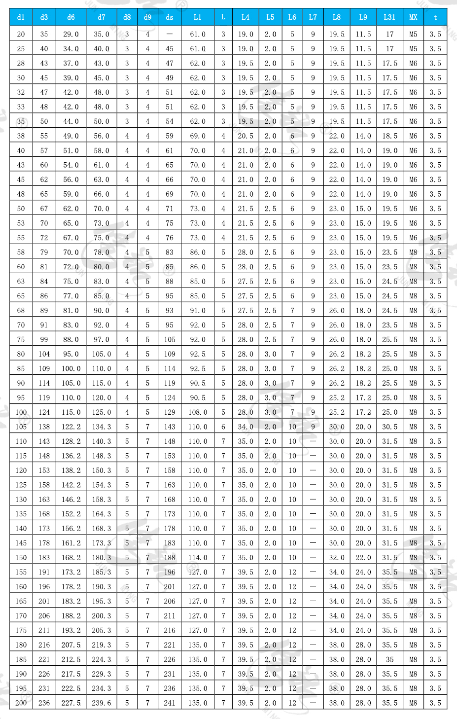 具有與“M7N”系列同樣設(shè)計(jì)性能,除驅(qū)動(dòng)座的安裝長(zhǎng)度外,其它安裝尺寸(d<100mm)符合 DIN 24960 標(biāo)準(zhǔn)。