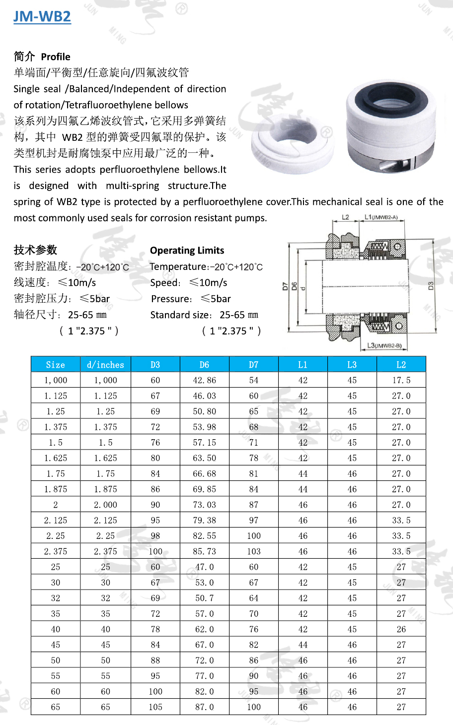 該系列為四氟乙烯波紋管式,它采用多彈簧結(jié)構(gòu),其中 WB2型的彈簧受四氟罩的保護。該類型機封是耐腐蝕泵中應(yīng)用最廣泛的一種。
