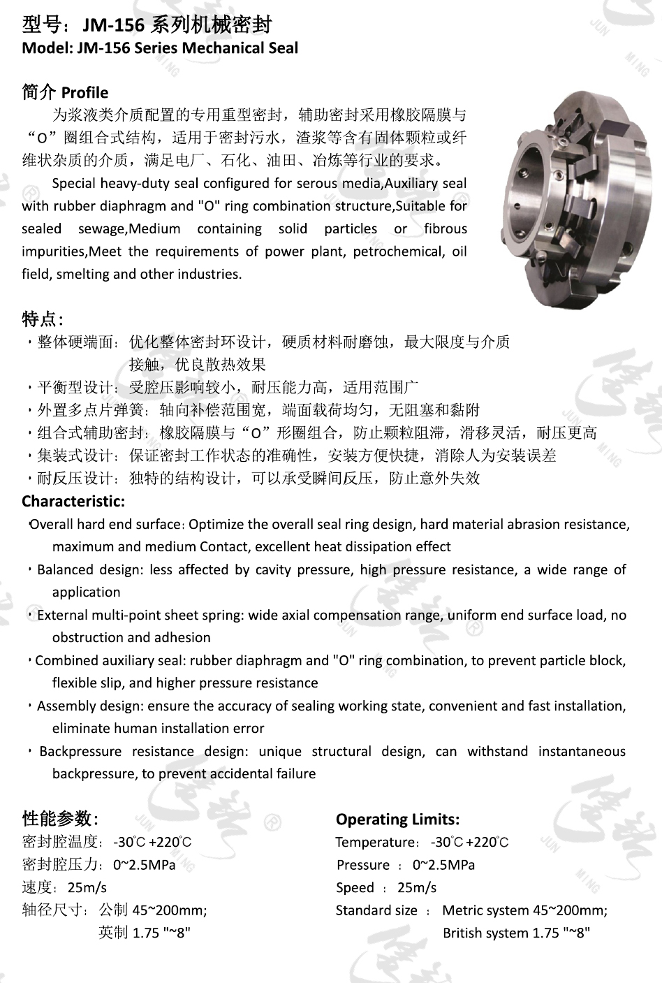 為漿液類(lèi)介質(zhì)配置的專(zhuān)用重型密封,輔助密封采用橡膠隔膜與“O”圈組合式結(jié)構(gòu),適用于密封污水,渣漿等含有固體顆?;蚶w維狀雜質(zhì)的介質(zhì),滿(mǎn)足電廠(chǎng)、石化、油田、冶煉等行業(yè)的要求。