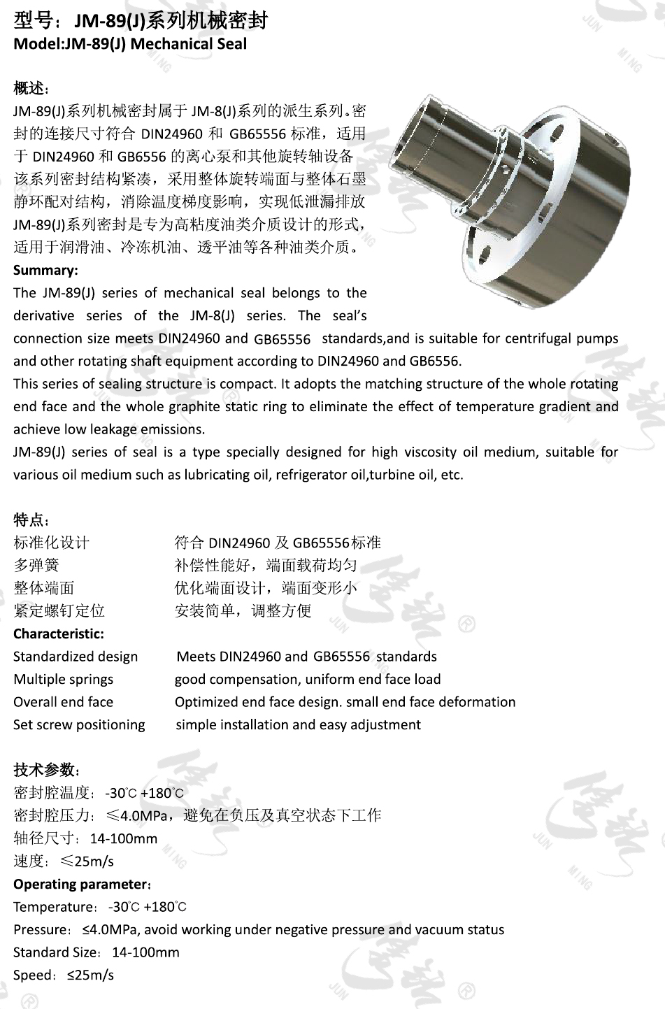 JM-89(J)系列機(jī)械密封屬于JM-8(J)系列的派生系列。密封的連接尺寸符合DIN24960和GB65556標(biāo)準(zhǔn),適用于DIN24960和GB6556的離心泵和其他旋轉(zhuǎn)軸設(shè)備