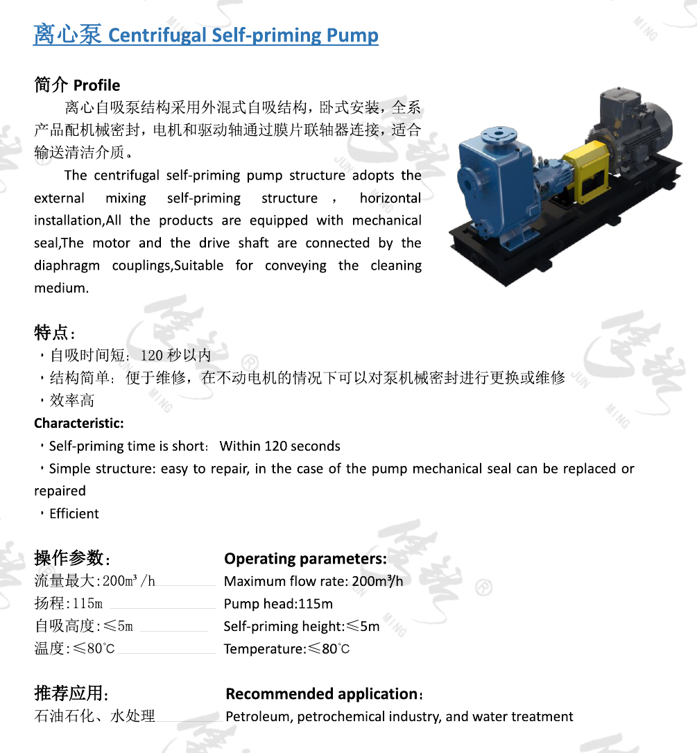 離心自吸泵結(jié)構(gòu)采用外混式自吸結(jié)構(gòu),臥式安裝,全系產(chǎn)品配機(jī)械密封,電機(jī)和驅(qū)動(dòng)軸通過膜片聯(lián)軸器連接,適合輸送清潔介質(zhì)。