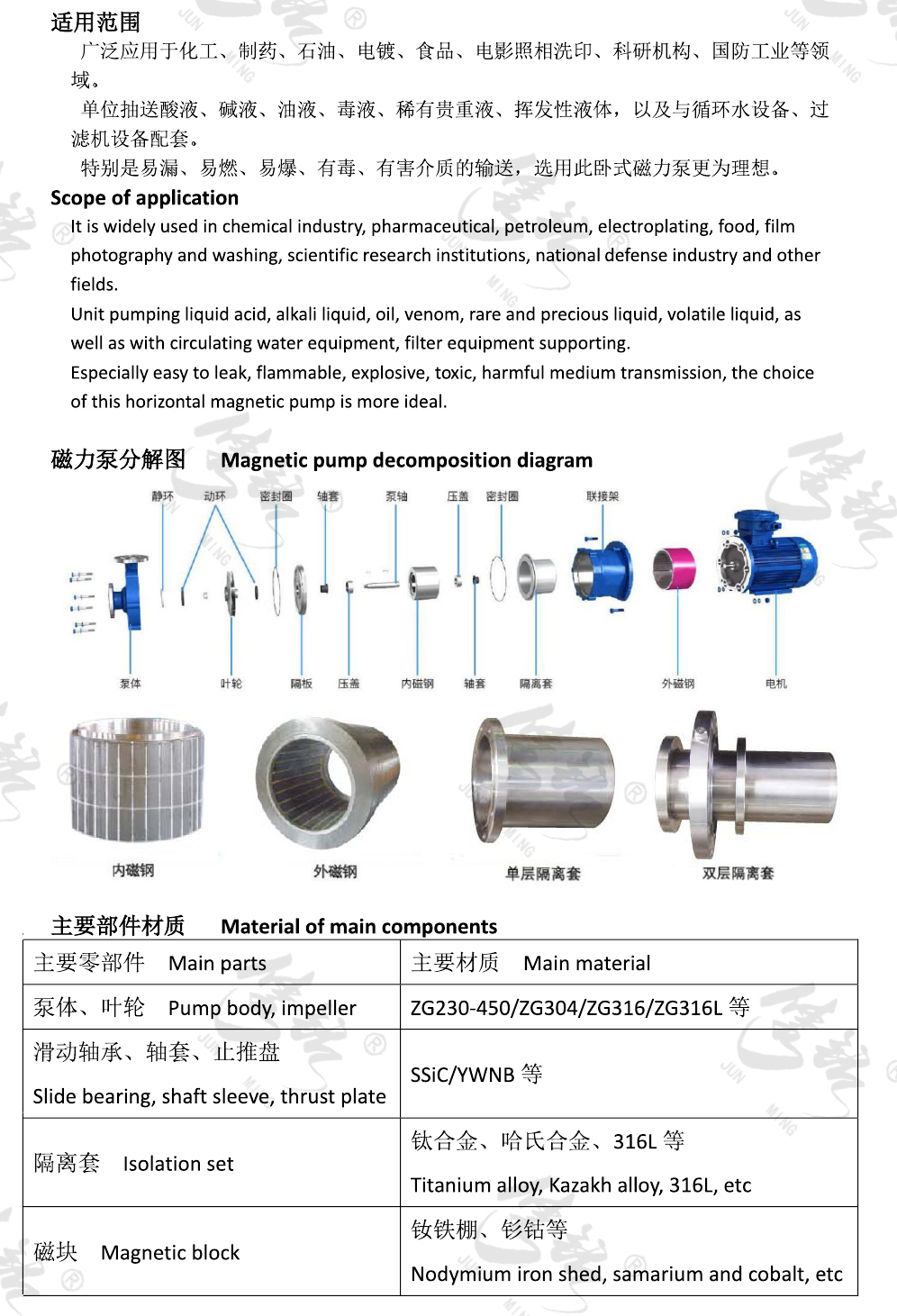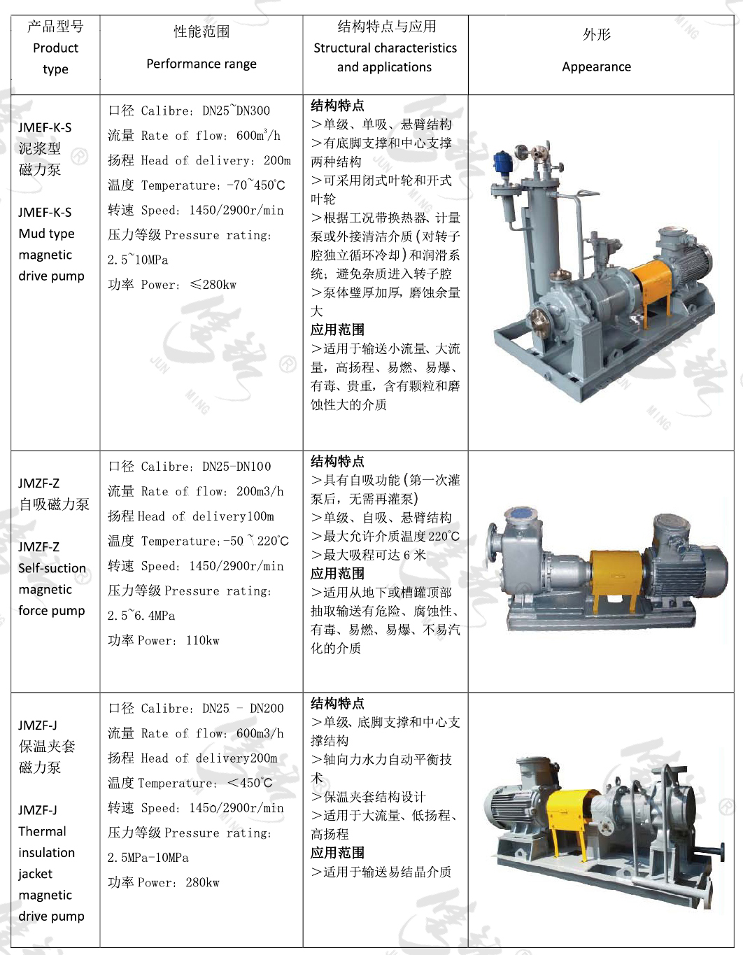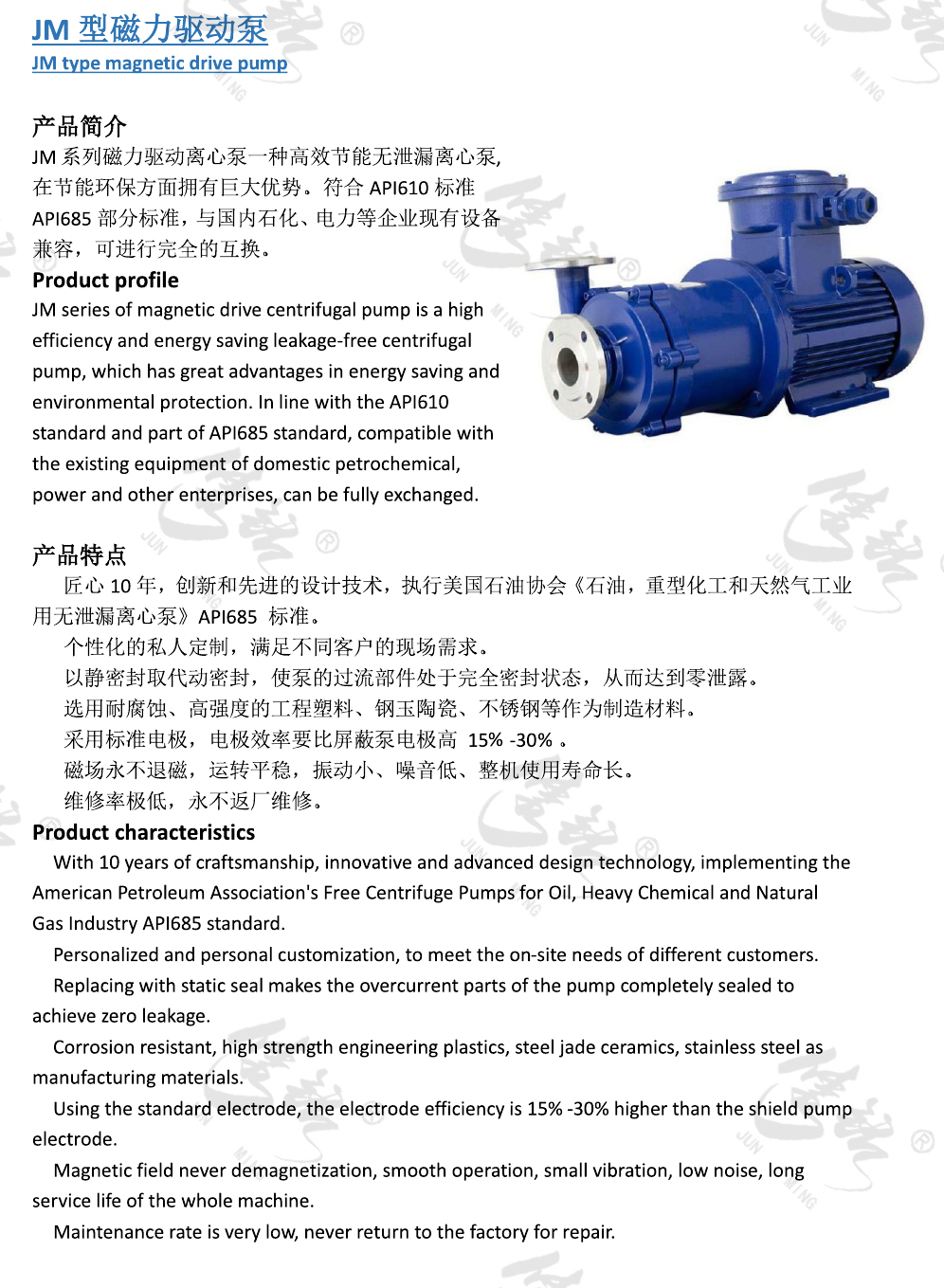 JM系列磁力驅(qū)動(dòng)離心泵一種高效節(jié)能無(wú)泄漏離心泵, 在節(jié)能環(huán)保方面擁有巨大優(yōu)勢(shì)。符合API610標(biāo)準(zhǔn)API685部分標(biāo)準(zhǔn),與國(guó)內(nèi)石化、電力等企業(yè)現(xiàn)有設(shè)備兼容,可進(jìn)行完全的互換。